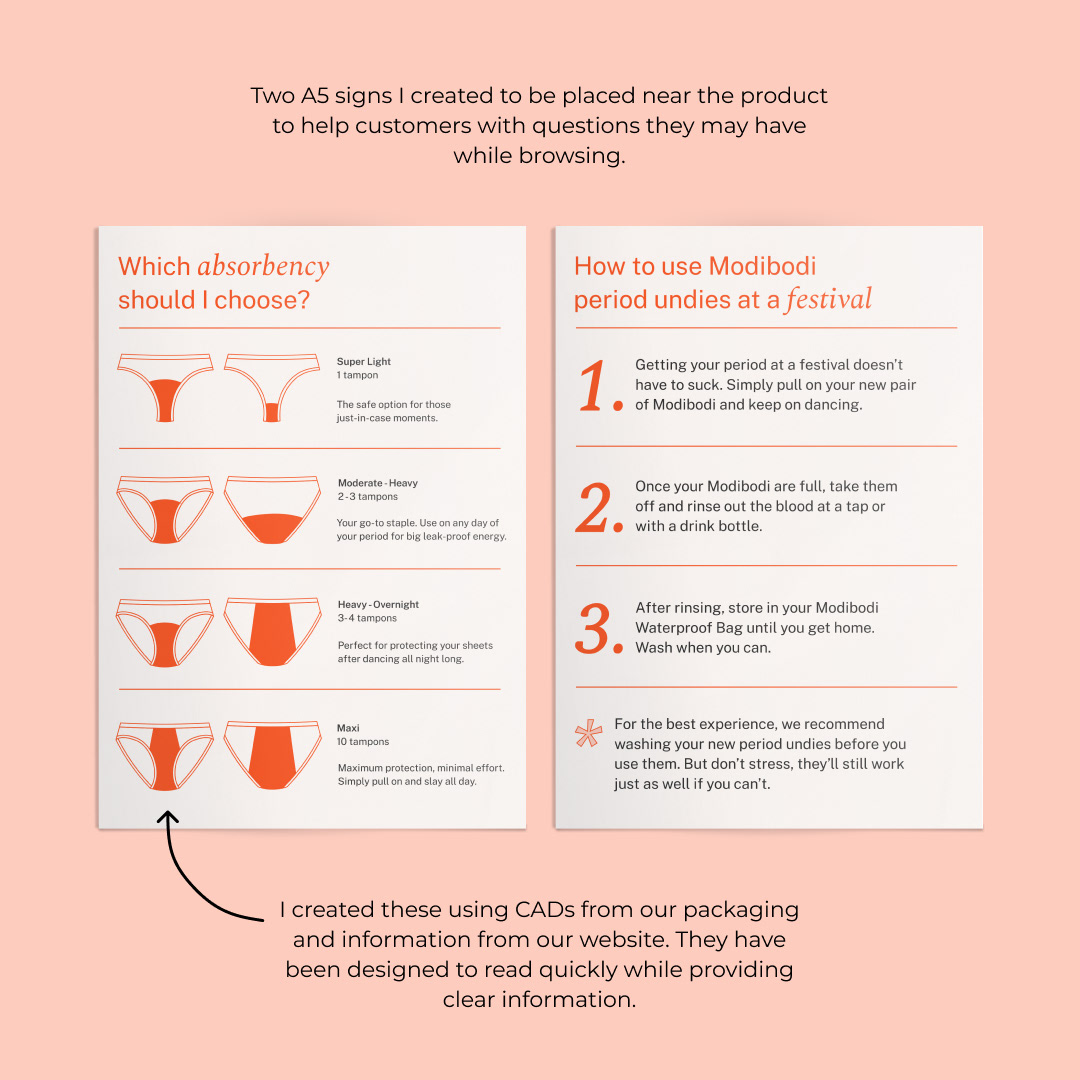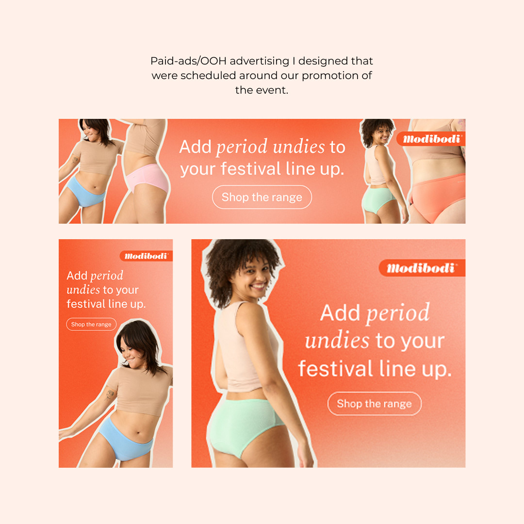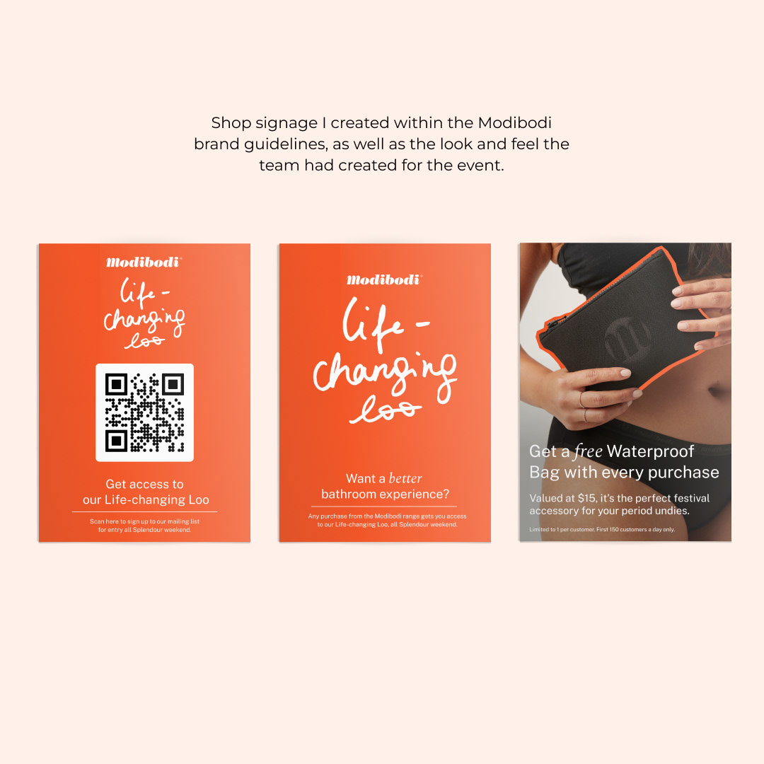 In 2023 Modibodi showcased their product range at Splendour in the Grass. The bright and fun pop-up stall featured clean and safe VIP toilets for customers to use while at the festival.